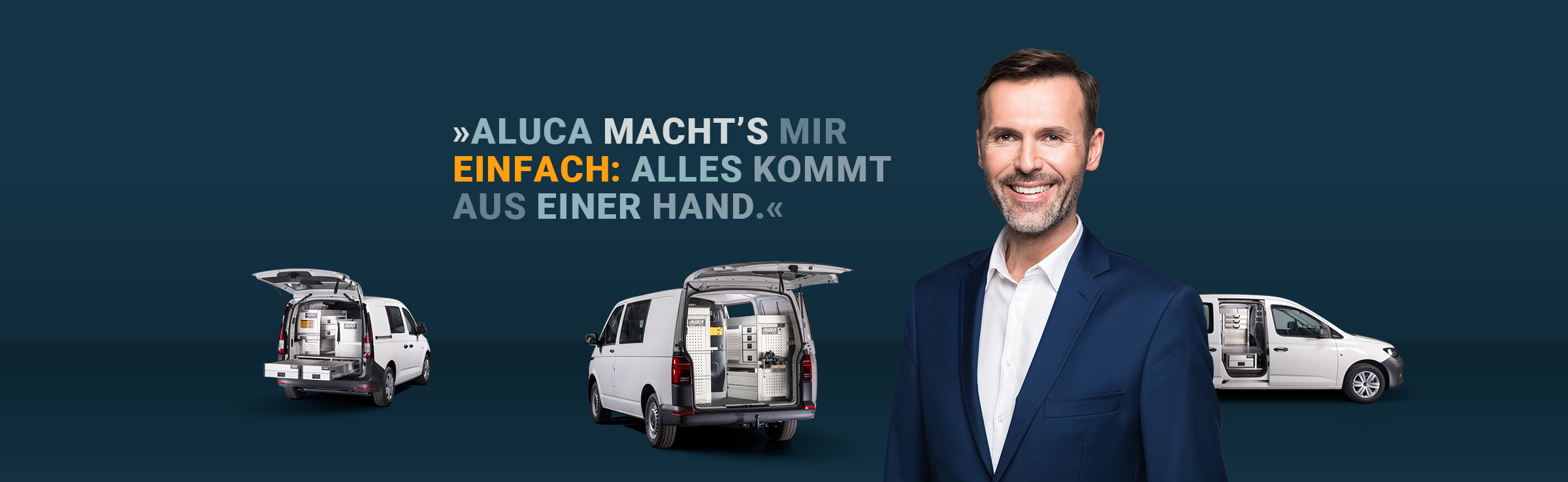 Helfen Sie Ihren Kunden, im Job richtig Gas zu geben! Mit ALUCA geht das schnell und easy: Wir sind führender Premium-Hersteller für hochwertige Fahrzeugeinrichtungen und Services für die professionelle Nutzung. Mit unseren drei vorkonfigurierten Paketen bekommt Ihr Kunde garantiert das perfekte Interior. Egal, welche Autoklasse oder -größe, ob für Kleinkastenwagen, Transporter oder Großraumtransporter – der Kunden fährt mit seiner schlüsselfertigen Werkstatt to go oder dem optimalen mobilen Arbeitsplatz aus Ihrem Autohaus heraus. So einfach können Sie Kunden happy machen.