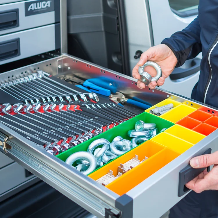Plus de place. Plus de sécurité. Plus d’ordre. Avec plus de 1 000 accessoires, vous maximisez la fonctionnalité de l’aménagement intérieur. De l’ordre jusque dans les moindres recoins ? Une mobilité et une organisation parfaites ? C'est possible avec des établis, des étaux, des porte-outils, mais aussi de nombreux petits accessoires de rangement très pratiques. Une vaste gamme allant de projecteurs de travail à des rails d’arrimage. Une alimentation électrique adéquate pour les outils électriques, l’éclairage du poste de travail et un ordinateur portable est également indispensable dans chaque atelier mobile. Qu’il s’agisse d'équipements de véhicules indispensables ou mineurs, il est possible d’apporter encore plus d’ordre et de rentabilité.