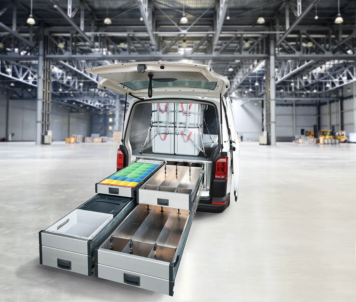 Encore plus de place pour les objets lourds dans le véhicule ! Les tiroirs grand format à combinaison variable, à ouverture totale jusqu’à 1 640 mm, assurent un rangement optimal et minimisent les va-et-vient fréquents. En effet, même si la surface de chargement est entièrement chargée, le véhicule reste accessible à tout moment. Tous les appareils, matériaux et accessoires peuvent être rangés de manière ergonomique. Y compris dans les petits véhicules utilitaires tels que les breaks, les fourgons ou les pick-ups. Disponible en 4 largeurs de travée, 8 profondeurs d’encastrement et 7 hauteurs de tiroir.